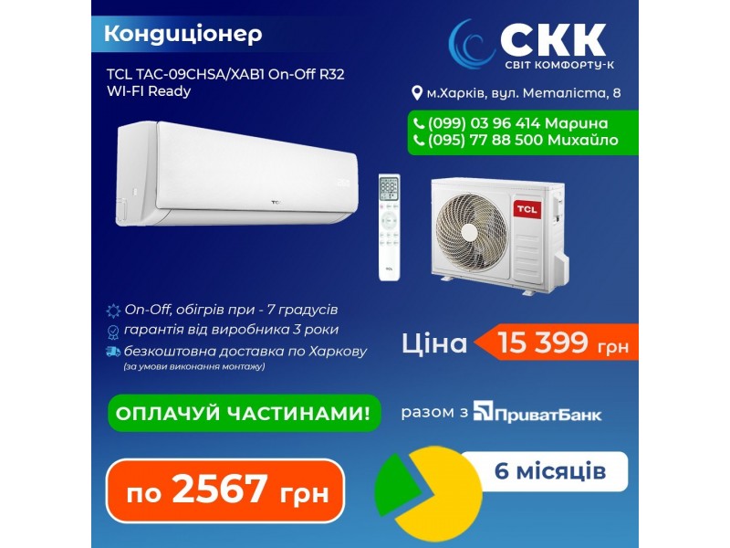 TCL TAC-09CHSA/XAB1 On-Off R32 WI-FI Ready — это доступный и надежный кондиционер для квартиры, дома или офиса площадью до 30 м². Модель сочетает простоту классической On/Off технологии, современный дизайн и возможность подключения Wi-Fi.